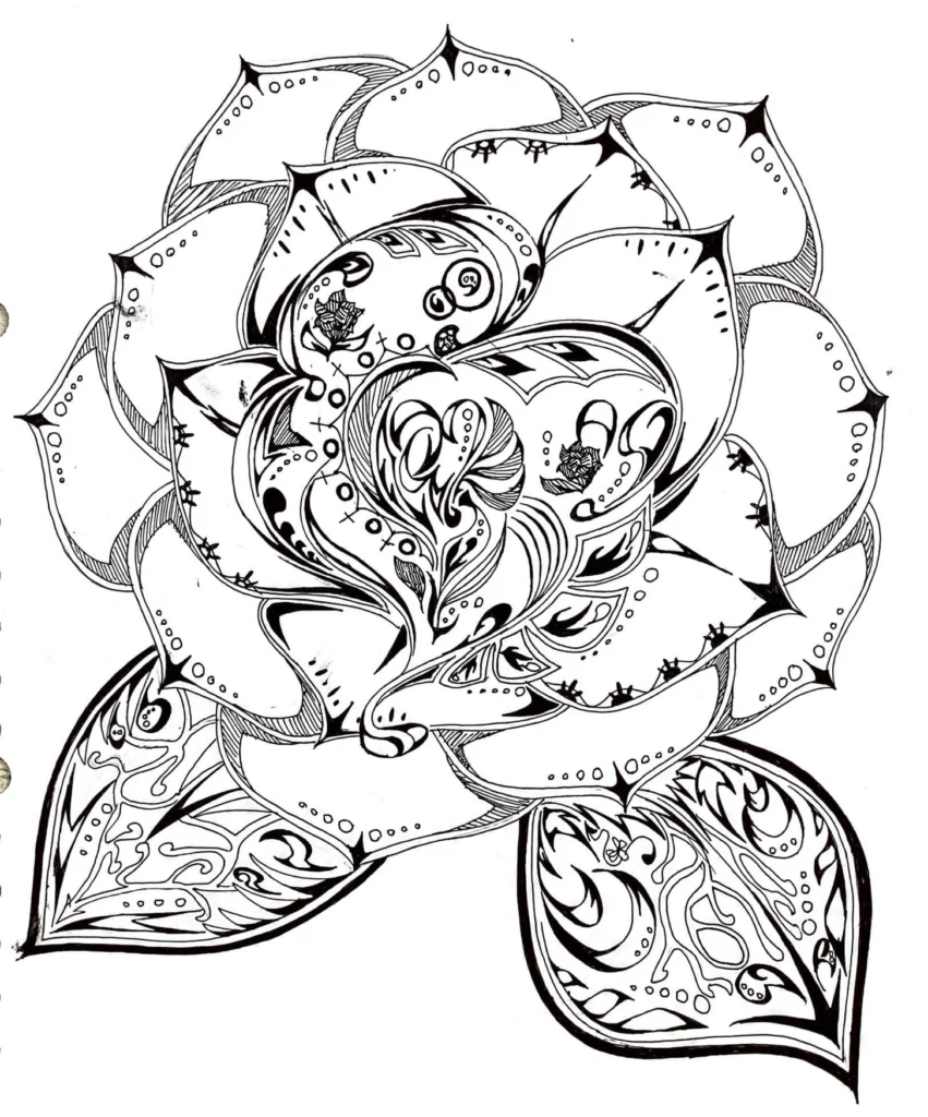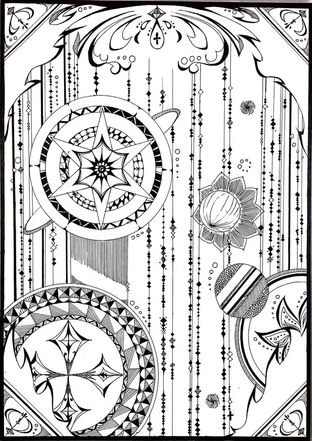 タイトルからもう病んでるんかな?って感じですね。ほんまにどないしたんや。中心の模様の形鳥が3枚目までと同じですから。これはひたすら花びらを増やしていって、そろそろ紙いっぱいになるわーと思ってやめて葉っぱ生やした感じですね。ちょっと葉脈から禍々しい雰囲気出てますけど。触手みたいやな。なんでこんな模様を思いついたのか本当に不思議です。何考えてたんでしょうね。当時。