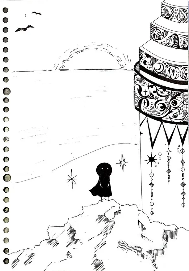 これそろそろ絵にストーリー性みたいなものを持たせたくなったんでしょうね、ちっちゃい人が登場するようになってます。朝日ののぼる灯台、もしくは夕日の沈む灯台…ベランダから見える朝日が小さいころからお気に入りなので、多分朝日ですね。もっと寂しい雰囲気も出したかったんですけど、人のサイズが大きすぎたのかあまり寂しげではないですね笑